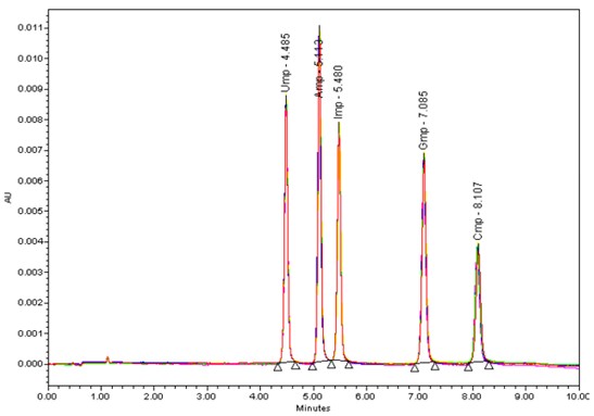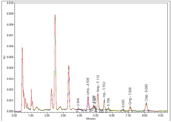 5種核苷酸混合標(biāo)準(zhǔn)品的6針連續(xù)進(jìn)樣分析結(jié)果
