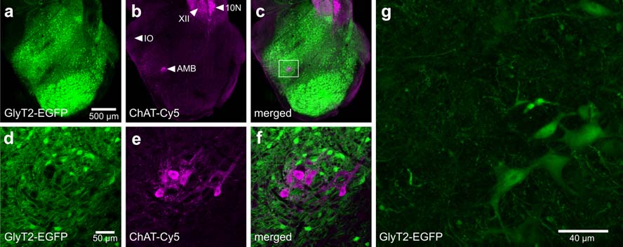 a–c 概觀了BAC(GlyT2-EGFP)-小鼠EGFP標(biāo)記的甘氨酸化神經(jīng)元 (a) 和延髓尾段中膽堿乙酰轉(zhuǎn)移酶(ChAT)的表達(dá) (b). ChAT抗體使用Cy5結(jié)合的熒光二抗通過(guò)共聚焦激光掃描顯微鏡檢測(cè)。C中顯示了兩個(gè)通道的疊加。