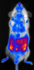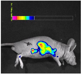 哺乳動物生物發(fā)光,一般是將Firefly luciferase基因(由554個氨基酸構(gòu)成,約50KD)即熒光素酶基因整合到預(yù)期觀察的細(xì)胞染色體DNA上以表達(dá)熒光素酶,培養(yǎng)出能穩(wěn)定表達(dá)熒光素酶的細(xì)胞株,當(dāng)細(xì)胞分裂、轉(zhuǎn)移、分化時, 熒光素酶也會得到持續(xù)穩(wěn)定的表達(dá);、細(xì)胞和活體動物都可被熒光素酶基因標(biāo)記。將標(biāo)記好的細(xì)胞接種到實(shí)驗(yàn)動物體內(nèi)后,當(dāng)外源(腹腔或靜脈注射)給予其底物熒光素(luciferin),即可在幾分鐘內(nèi)產(chǎn)生發(fā)光現(xiàn)象。這種酶在ATP,氧存在的條件下,催化熒光素的氧化反應(yīng)才可以發(fā)光,因此只有在活細(xì)胞內(nèi)才會產(chǎn)生發(fā)光現(xiàn)象,并且發(fā)光光強(qiáng)度與標(biāo)記細(xì)胞的數(shù)目線性相關(guān)。