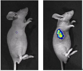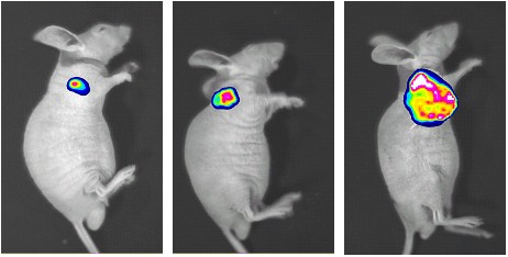 在藥效學(xué)評價方面,熒光素酶癌癥模型可用于癌癥體內(nèi)用藥在整體動物水平上進(jìn)行長期療效跟蹤觀察。利用無創(chuàng)傷活體成像對癌細(xì)胞生長的檢測,可對癌癥治療之前和過程中的癌細(xì)胞的變化進(jìn)行實(shí)時觀測和評估。這種方式提供一個很好的對癌細(xì)胞的反應(yīng)和復(fù)發(fā)評估的預(yù)診斷途徑。用活體成像的方法比傳統(tǒng)技術(shù)有更高的靈敏度,當(dāng)用傳統(tǒng)的方法還不能檢測到瘤塊時,用該技術(shù)已經(jīng)可以檢測到很強(qiáng)的信號。由于該技術(shù)只是檢測活細(xì)胞,不能檢測已經(jīng)凋亡的細(xì)胞。而用傳統(tǒng)的方法,不能區(qū)別正常細(xì)胞與凋亡的細(xì)胞,所以該技術(shù)可以比傳統(tǒng)技術(shù)更早更靈敏的發(fā)現(xiàn)藥物的療效。