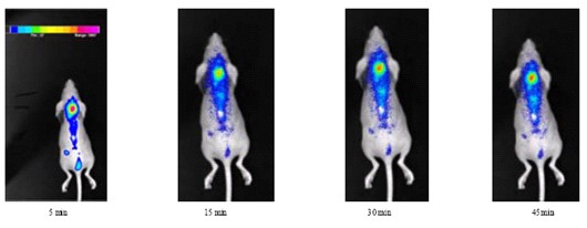(3) 熒光素在體內(nèi)擴(kuò)散速度快,可通過腹腔注射或尾部靜脈注射進(jìn)入動物體內(nèi)。腹腔注射擴(kuò)散較慢,持續(xù)發(fā)光長。熒光素腹腔注射老鼠后約1min后表達(dá)熒光素酶的細(xì)胞開始發(fā)光,10min后強(qiáng)度達(dá)到穩(wěn)定的最高點(diǎn),在最高點(diǎn)持續(xù)約20~30 min后開始衰減,約3h后熒光素排除,發(fā)光全部消失,最佳檢測時間是在注射后15~35min之間;若進(jìn)行熒光素靜脈注射,擴(kuò)散快,但發(fā)光持續(xù)時間很短?蒲腥藛T根據(jù)大量的實(shí)驗(yàn)總結(jié)出熒光素的合適的用量是150mg/kg,即體重20克的小鼠需要3毫克的熒光素。