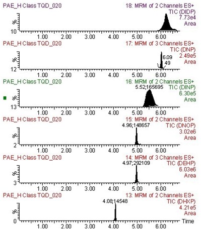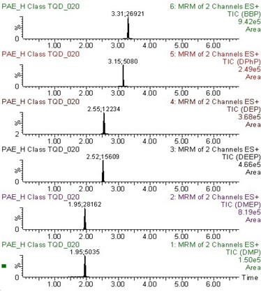 本方法介紹了兩種基于沃特世超高效液相色譜技術(shù)(UPLC®技術(shù))分析18種(含臺灣FDA要求)鄰苯二甲酸鹽的方法,方法一為采用沃特世超高效液相色譜質(zhì)譜聯(lián)用技術(shù)(UPLC/MS/MS),該方法具有分析速度快,靈敏度高的特點。適用于實驗室擁有質(zhì)譜系統(tǒng)并追求檢測靈敏度的用戶。方法二為采用沃特世超高效液相色譜系統(tǒng)和二極管陣列檢測器(UPLC/PDA)分析方法,適用于暫時還不具有質(zhì)譜系統(tǒng)的用戶。