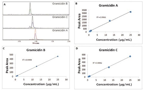 圖5,圖A-25.0、12.5、1.25和0.625mg/mL濃度的標(biāo)準(zhǔn)溶液中含有短桿菌肽物質(zhì)的疊加選擇離子譜。圖B、C和D-每種短桿菌肽A、B和C各自的MS峰面積線性擬合圖。