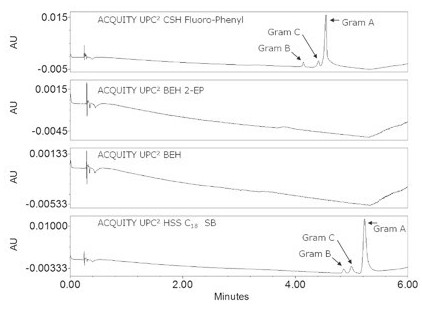 我們系統(tǒng)性地篩選了四種色譜柱,測(cè)定哪種分離效果最佳,結(jié)果如圖1所示,色譜柱篩選過程可在1小時(shí)內(nèi)非常快速地完成。在我們?cè)O(shè)定的篩選條件下,BEH 2-EP和BEH色譜柱未檢測(cè)到譜峰,由于其它色譜柱表現(xiàn)出合適的色譜性能,因而未對(duì)這兩者的非洗脫原因深入研究,其中ACQUITY UPC2 CSH氟苯基色譜柱檢測(cè)的色譜峰形最佳,因此采用該色譜柱繼續(xù)研究。