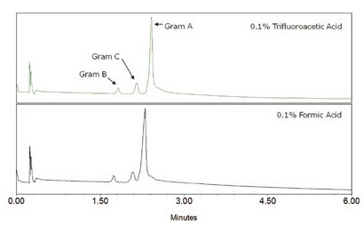 為了分離短桿菌肽物質(zhì),對(duì)酸性改性劑的影響進(jìn)行了研究,結(jié)果表明:使用三氟乙酸(TFA)可得到稍好的峰形,提高了短桿菌肽A和短桿菌肽C之間的分離度,結(jié)果如圖2所示。已知TFA會(huì)抑制質(zhì)譜電離,但每種物質(zhì)的信號(hào)都足以定量檢測(cè)治療制劑,后續(xù)將對(duì)此進(jìn)行討論。對(duì)于要求更高靈敏度的應(yīng)用,可能需要降低TFA濃度或使用甲酸,以達(dá)到希望的檢測(cè)限值。