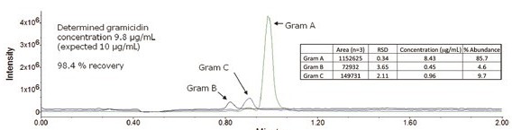 圖6. 從抗菌軟膏中萃取的短桿菌肽A、B和C的疊加選擇離子譜重復(fù)進(jìn)樣分析的計(jì)算RSD值(N=3)在可接受限值以內(nèi),計(jì)算豐度與文獻(xiàn)報(bào)道數(shù)值非常吻合1。
