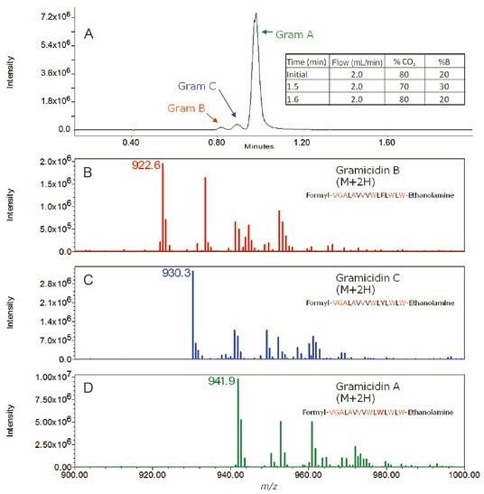 我們研究了色譜柱化學(xué)品、流動(dòng)相改性劑和梯度斜率對(duì)分離短桿菌肽的影響。采用優(yōu)化方法分離市場(chǎng)上銷售的非處方藥物(OTC),將測(cè)定的短桿菌肽濃度與標(biāo)示量進(jìn)行對(duì)比。采用質(zhì)譜儀測(cè)定短桿菌肽的濃度,采用選擇離子譜表征每種物質(zhì)。在ACQUITY UPC2系統(tǒng)上使用我們的方法,可得到線性和可重復(fù)的結(jié)果——測(cè)定的OTC制劑濃度為標(biāo)示量的98.4%。