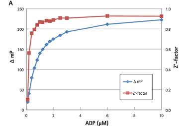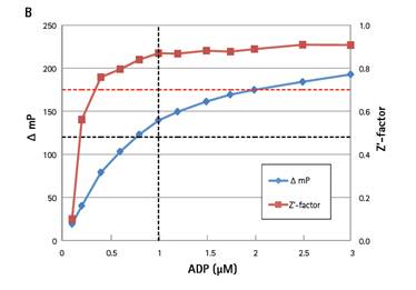 A:模擬10uM ATP轉(zhuǎn)化至ADP時標(biāo)準(zhǔn)曲線的Z值和Δ mP值;B:當(dāng)微孔板檢測儀設(shè)置為100ms檢測時間,放大標(biāo)準(zhǔn)曲線視圖,ADP濃度范圍在0-3uM之間時顯示出驗證Z值的最少數(shù)據(jù)點(紅色虛線)和驗證Δ mP值的最少數(shù)據(jù)點(水平黑色虛線),也顯示出10%ATP轉(zhuǎn)化驗證點(垂直黑色虛線)