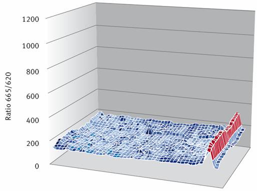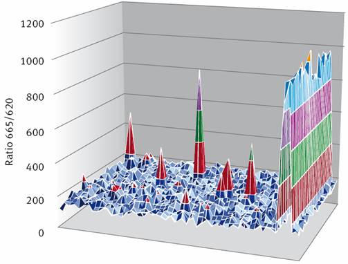 通過計算兩個發(fā)射波長(Em 665 nm / Em 620 nm) 下的HTRF®比率來評估分析結(jié)果, 1536微孔板的3維表面圖的尖峰表示得到的hits(活性化合物)。 | |||||||||||||||||