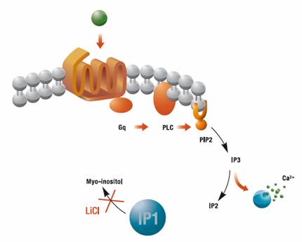 G-蛋白偶聯(lián)受體(GPCRs)為跨膜蛋白,是介導(dǎo)細(xì)胞外刺激信號的關(guān)鍵角色。GPCRs與胞內(nèi)一系列復(fù)雜的復(fù)合物相互作用調(diào)控非常大量的下游效應(yīng)物質(zhì)。其產(chǎn)物三磷酸肌醇(IP3)是其中一個第二信使,是對Gq-蛋白偶聯(lián)受體被激活的應(yīng)答而產(chǎn)生的。然而,IP3的半衰期非常短,對于藥物篩選而言,是很難對其進(jìn)行測定的。因此,對由IP3觸發(fā)的鈣釋放的監(jiān)測,作為該信號通路的下游信號被廣泛應(yīng)用。另外一個監(jiān)測IP3的方法是檢測磷酸肌醇(IP1)的累積,磷酸肌醇(IP1)是三磷酸肌醇(IP3)的下游代謝產(chǎn)物。 |