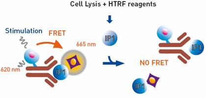 該分析方法采用與IP1特異性結(jié)合的單克隆抗體,其原理是基于胞內(nèi)累積的IP1與其競爭性結(jié)合從而抑制了HTRF®供體和受體之間的熒光共振能量轉(zhuǎn)移(FRET)。建立一個IP1標(biāo)準(zhǔn)校正曲線可用于計算因復(fù)合物作用而引起的胞內(nèi)累積的IP1的濃度,從而相應(yīng)得到了復(fù)合物的濃度。 | ||||||||||||||||