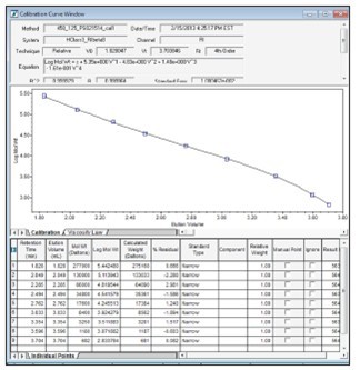 使用帶有GPC選項的Empower 3軟件進行數(shù)據(jù)校準并生成校準曲線。最后,根據(jù)聚砜校準曲線再次自動測定這份聚砜樣品的分子量參數(shù),以對聚合物進行表征。