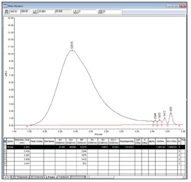 圖2. 聚砜色譜圖。諸如Mw、Mn、Mz和聚合物分散指數(shù)之類的分子量參數(shù)根據(jù)使用一組窄分布聚苯乙烯標準品生成的校準曲線計算而得。