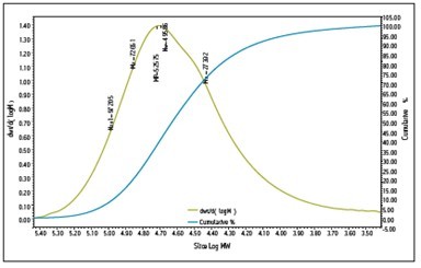 一旦數(shù)據(jù)被自動積分和定量分析,立即生成一條校準曲線。圖1顯示了以Mp對數(shù)值相對于保留體積進行繪圖所得到的聚苯乙烯校準曲線。一旦校準曲線生成,立即對該樣品進行處理,同時計算分子量分布情況并將其顯示在一張常規(guī)Empower數(shù)據(jù)表中,如圖2所示。使用Empower 3軟件中的GPC選項進行進一步數(shù)據(jù)處理允許用戶能以多種方式直觀顯示聚合物數(shù)據(jù),其中包括可在同一張圖中同時顯示dwt/d(logM)和累積%分別相對于切片內(nèi)分子量對數(shù)值變化情況的分子量分布圖,如圖3所示?蓪⒎治鰯(shù)據(jù)輸出或者使用現(xiàn)有模板或自定義報告模板生成一份包含任何或全部結(jié)果(包括分子量、色譜圖、分布圖和校準曲線)的報告。