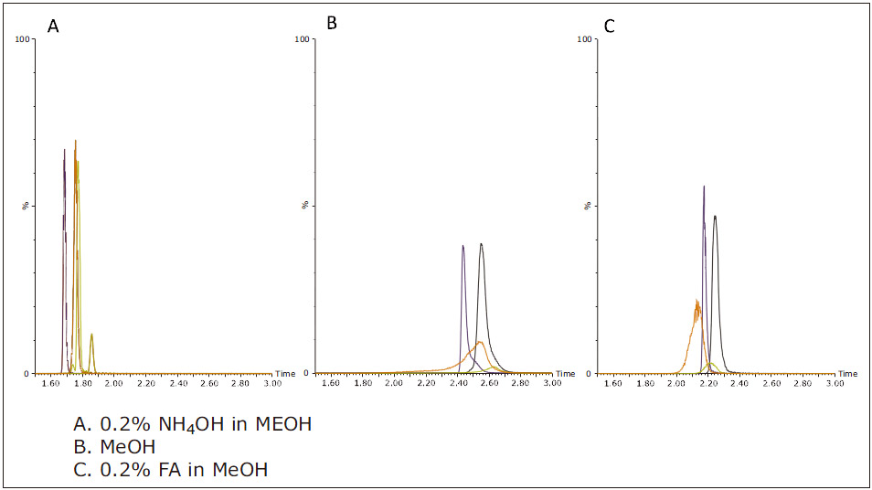 圖3:使用BEH色譜柱時,流動相B中加入不同改性劑后所得分析結(jié)果。
