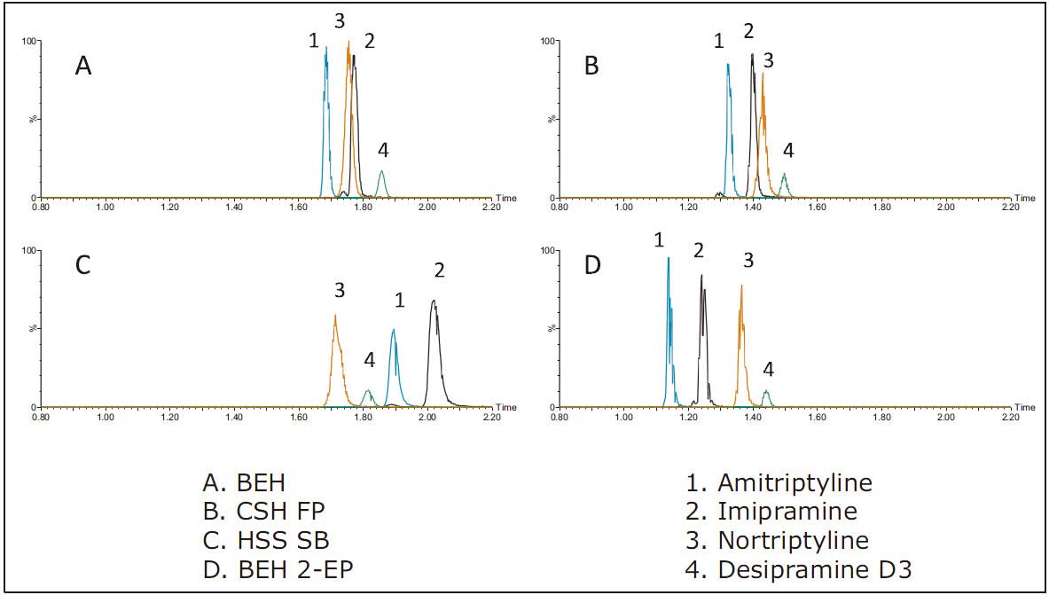 在不同色譜柱的篩選實驗中,阿米替林和丙咪嗪的峰面積無顯著變化,但地昔帕明和去甲替林受固定相化學(xué)性質(zhì)的影響,峰面積發(fā)生了明顯改變。例如,地昔帕明在使用BEH色譜柱分析時所得峰面積較其它色譜柱增大了11%至40%。同樣,去甲替林的峰面積在BEH色譜柱分析條件下較其它色譜柱增大了21%至40%。雖然BEH 2-EP色譜柱的總體分離效果較其它色譜柱稍有改善,但采用BEH色譜柱時信號強(qiáng)度更高。因此BEH色譜柱是進(jìn)行TCA低濃度水平定量分析的最佳選擇。此外,BEH色譜柱所得色譜峰的平均基線峰寬<2 s,提高了低濃度樣品測定的信噪比。