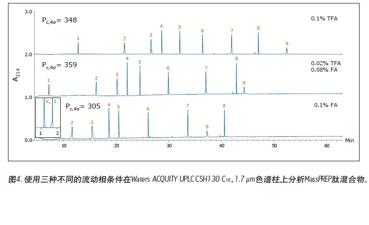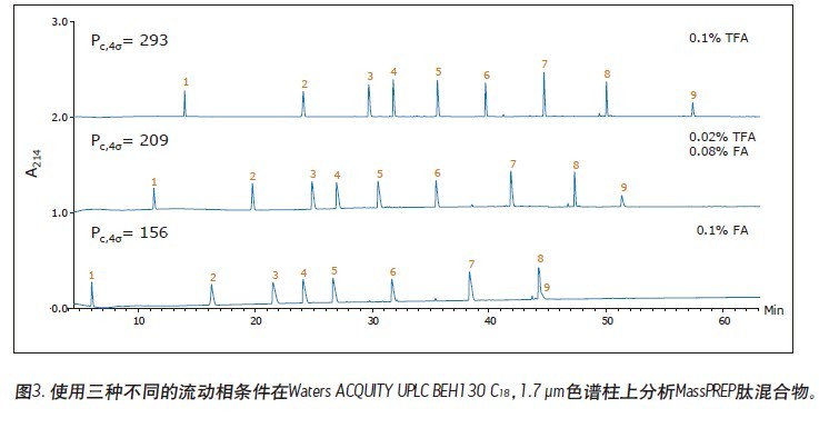 圖1是在不同的流動(dòng)相條件下使用一根5 μm硅膠C18色譜柱得到的三張MassPREP的色譜圖。使用TFA進(jìn)行分離得到的色譜峰一般都是對稱的。大部分色譜峰并未出現(xiàn)過度的峰展寬或拖尾的現(xiàn)象。但是,使用含有甲酸的流動(dòng)相得到的峰形極不理想。此外,混合物中最大的肽——蜂毒素并未被檢測出來,原因可能是峰過寬或根本沒洗脫出來。對于使用HPLC進(jìn)行的肽分離,這樣的結(jié)果是很常見的。