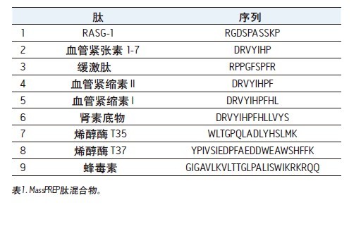 如表1所示,MassPREP肽混合物(部件編號(hào)186002337)使用0.1%FA水溶液重新溶解,使總肽濃度大約為0.6 mg/mL。