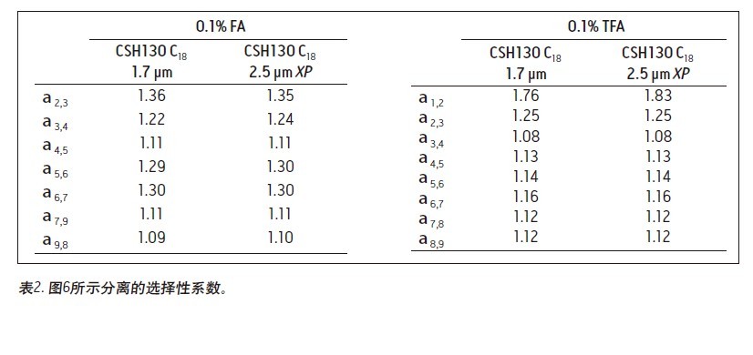 許多肽分離操作仍在傳統(tǒng)的HPLC儀器上進(jìn)行。因其背壓過高,使用亞2 μm填充的色譜柱通常不適合與HPLC系統(tǒng)聯(lián)用。而2.5 μm色譜柱因其背壓較低可以在任何LC儀器上使用。為確定CSH130 C18,1.7μm色譜柱得到的峰容量是否可以成功轉(zhuǎn)移到CSH130 C18 XP,2.5 μm色譜柱上,針對2.5 μm XP色譜柱設(shè)置了一種從一根1.7μm色譜柱轉(zhuǎn)移出來的HPLC兼容的方法。這種轉(zhuǎn)移如下所述:按照ACQUITY UPLC色譜柱計(jì)算器的建議18,將流速降低,增加梯度時(shí)間,降低和增加的系數(shù)均為1.5。圖6顯示,使用1.7 μm色譜柱進(jìn)行的分離成功地轉(zhuǎn)移到了2.5μm XP色譜柱上。選擇性系數(shù)的一致性強(qiáng)調(diào)了這一觀察結(jié)果,如表2所示。與1.7顆粒的色譜柱相比,使用2.5μm XP顆粒進(jìn)行分離時(shí)背壓出現(xiàn)極大地降低(~3000psi比 ~8000 psi),從而表明了CSH技術(shù)可以輕松應(yīng)用于UPLC或HPLC進(jìn)行的高峰容量肽分離中。