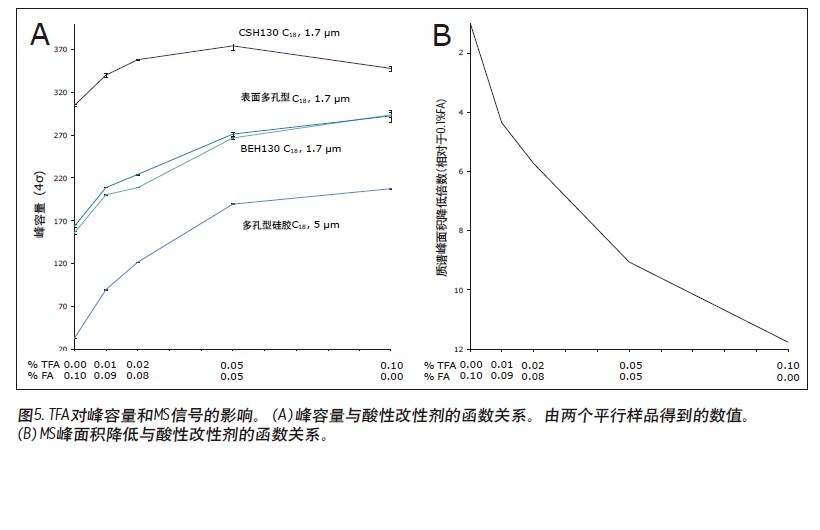 對這些定性分離的比較表明CSH130 C18比其他色譜柱具有性能上的優(yōu)勢。但是,定量更引人注目。在每個(gè)分離中觀察到的峰容量按照實(shí)驗(yàn)部分的方法計(jì)算。圖5A顯示了在每種色譜柱上酸性改進(jìn)劑組成與峰容量之間的關(guān)系。圖5A的左部分是僅使用FA而不使用TFA離子對試劑得到的峰容量值。沿X軸向右是與FA濃度降低、TFA濃度升高時(shí)對應(yīng)的峰容量值。CSH130 C18色譜柱的性能優(yōu)勢很容易顯現(xiàn)出來。使用0.1%TFA時(shí),CSH130 C18色譜柱的峰容量比其他1.7 μm C18色譜柱大20%。但是,如果使用含有0.1%甲酸的流動(dòng)相,CSH130 C18色譜柱的峰容量比其他1.7 μm色譜柱大90%。因此,CSH130 C18不僅比其他色譜柱具有更大的峰容量,而且其性能對三氟乙酸的依賴性很小。由此帶來的最明顯效果是CSH130 C18色譜柱與質(zhì)譜具有很高的兼容性。在這些分析中,三氟乙酸對肽質(zhì)譜檢測的影響見圖5B。我們知道,在電噴霧離子化過程中,TFA會(huì)引起嚴(yán)重的離子抑制16-17。因此,使用TFA而不使用FA時(shí),質(zhì)譜信號(hào)降低12倍。CSH130 C18色譜柱并不需要太多TFA(如果有)來獲得最佳峰容量,因此成為需要高靈敏度LC/MS應(yīng)用的理想選擇。