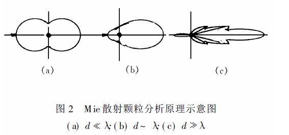 Mie 散射理論是球形顆粒對單色光的散射場分布的嚴(yán)格解析解。夫瑯禾費(fèi)衍射是Mie 散射理論在特定條件下的近似。Mie 散射理論指出,當(dāng)顆粒直徑比入射光波長小得多時,顆粒的前向散射與后向散射場分布對稱;當(dāng)顆粒直徑與入射光波長近似時,前向散射比后向散射強(qiáng),且散射場關(guān)于入射光軸呈周期分布;當(dāng)顆粒直徑比入射光波長大得多時,顆粒將只有前向散射場,這正與夫瑯禾費(fèi)衍射理論一致(見圖2) 。由此可見,Mie 散射理論比夫瑯禾費(fèi)衍射理論適用范圍更廣,更精確[7, 8]。