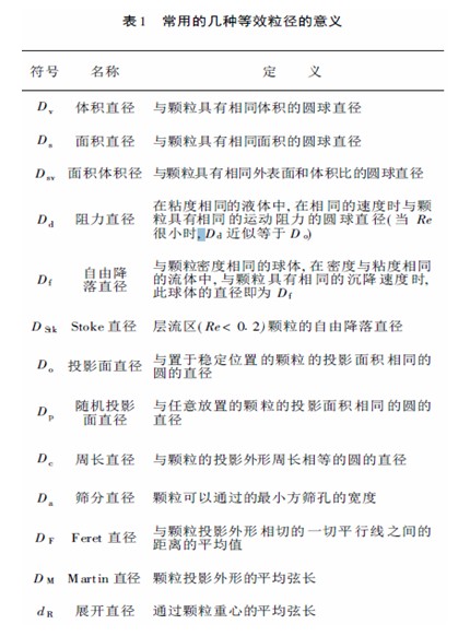 “等效”可以有很多方法:體積等效、橫截面積等效、沉降等效、光學(xué)等效等等,可以認(rèn)為有一種測(cè)量方法就有一種等效的意義。表1 給出了常用的幾種等效粒徑的定義[1]。