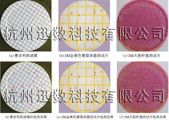 圖 6展示了采用迅數(shù)科技開發(fā)的“基于形態(tài)約束的水平集活動(dòng)輪廓模型”,對(duì)網(wǎng)格濾膜和3M測(cè)試片的檢測(cè)效果。其中,圖6-a、6-b、6-c分別是塞多利斯濾膜、3M金黃色葡萄球菌測(cè)試片、3M大腸桿菌測(cè)試片的原圖。圖6-d、6-e、6-f是采用“基于形態(tài)約束的水平集活動(dòng)輪廓模型”后的分割效果。由于具有圓形約束,活動(dòng)輪廓避免了對(duì)網(wǎng)格的逼近,而最終檢測(cè)出全部圓形菌落。