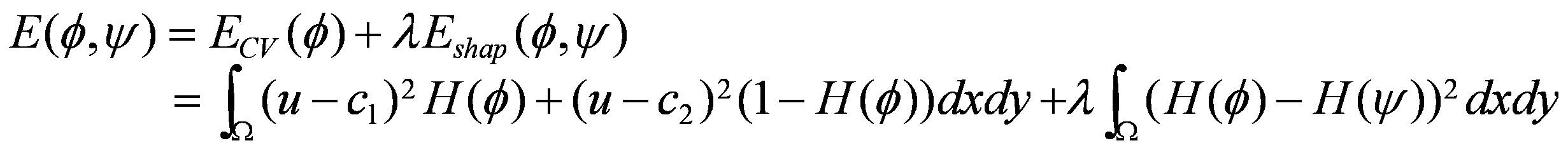 一種是Cremers提出的基于先驗(yàn)知識(shí)約束的模型。設(shè)先驗(yàn)知識(shí)所確定的形狀用水平集Ф0表示,基于形狀先驗(yàn)知識(shí)的活動(dòng)輪廓模型在能量泛函中加入一項(xiàng)形狀約束能量項(xiàng),用來引導(dǎo)曲線收斂于這個(gè)形狀:
