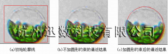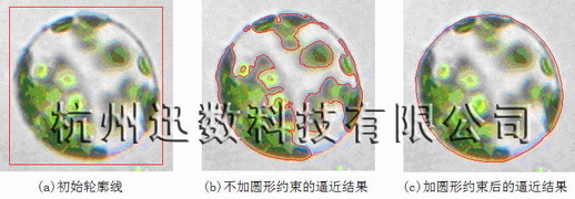 圖4顯示了對(duì)一個(gè)邊緣模糊的原生質(zhì)體細(xì)胞的檢測(cè)效果。其中,圖4-a是原生質(zhì)體細(xì)胞原圖;圖4-b采用的是一般的水平集活動(dòng)輪廓模型,由于缺乏圓形約束,檢測(cè)到的是一個(gè)非圓;圖4-c采用的是迅數(shù)科技開發(fā)的“基于形態(tài)約束的水平集活動(dòng)輪廓模型”算法,由于受到圓形約束,最后逼近的必然是個(gè)圓,從而很好的還原了細(xì)胞原態(tài)。