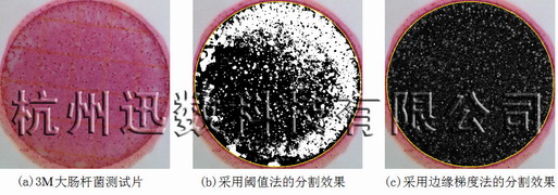圖3-a是3M大腸桿菌測(cè)試片,表面有紅色網(wǎng)格、紅色菌落、和紅色背景。這種情況是最復(fù)雜的,無論采用傳統(tǒng)的閾值分割法(圖3-b)、還是彩色梯度分割法(圖3-c),都不可能得到理想的效果。