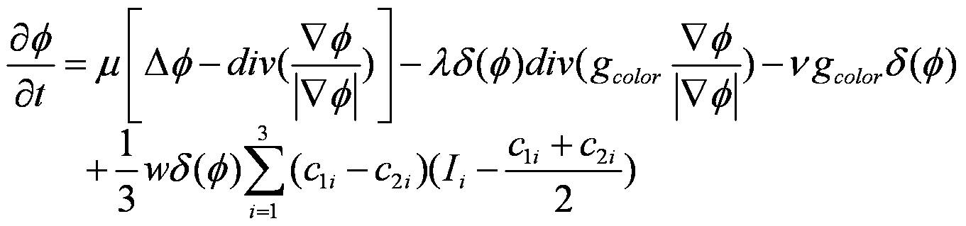 其中c1i和c2i是輪廓線內(nèi)外三個(gè)通道的平均值,Ii對(duì)應(yīng)三個(gè)通道強(qiáng)度值。綜合基于梯度和基于CV模型的彩色活動(dòng)輪廓模型的曲線演化方程如下: