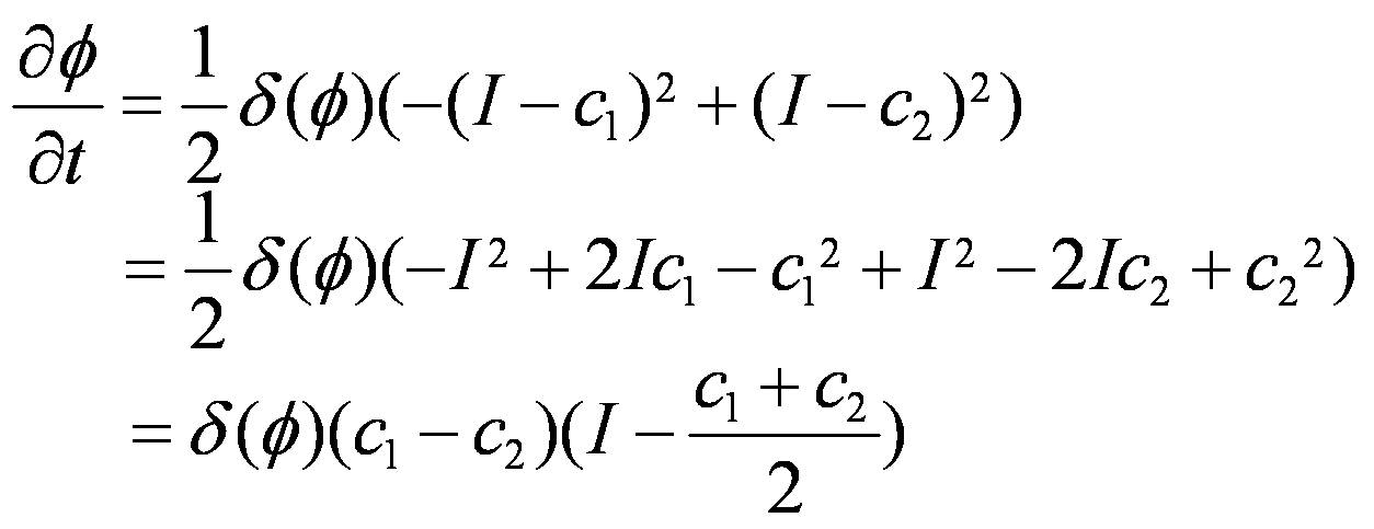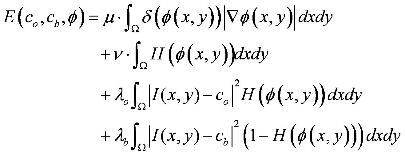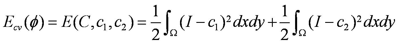 水平集活動(dòng)輪廓模型的基本原理,是把曲線或曲面嵌入高一維水平集函數(shù)中,用一個(gè)高維函數(shù)來(lái)表達(dá)低維曲線或曲面的演化過(guò)程。建立具有閉合曲線長(zhǎng)度和面積平滑約束項(xiàng)的二維能量泛函(即CV模型):