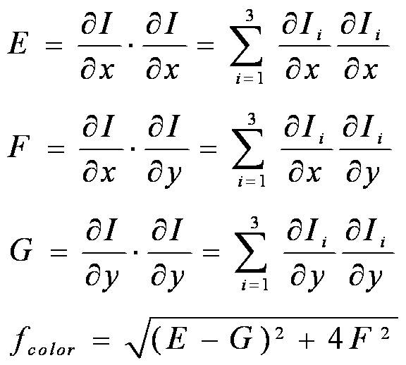 傳統(tǒng)的CV模型只利用灰度信息,對(duì)色彩信息豐富的多色菌落分割效率低。為了將彩色信息融入其中,把傳統(tǒng)的基于灰度信息的梯度指示函數(shù)改為基于彩色信息的梯度指示函數(shù)。設(shè)I(x,y)表示彩色圖像在點(diǎn)(x,y)處的三個(gè)R、G、B向量。定義E、F、G和fcolor如下: