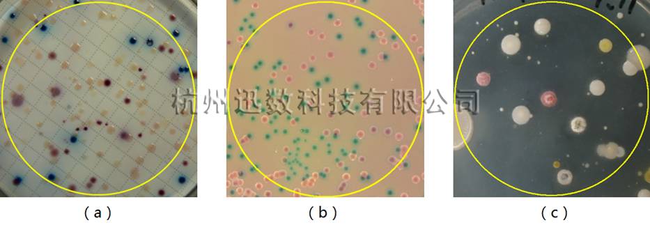 (1)屬于同一種顏色的各個(gè)菌落,其表面顏色并非完全一樣,有時(shí)還往往存在相當(dāng)大的差異。比如下圖1-a、1-b中,紅色菌落有深紅色和淺紅色,但顯然它們屬于同一類(lèi);下圖1-c中,二個(gè)紅色菌落顏色深淺不一樣,而且表面還有反光引起的色斑。