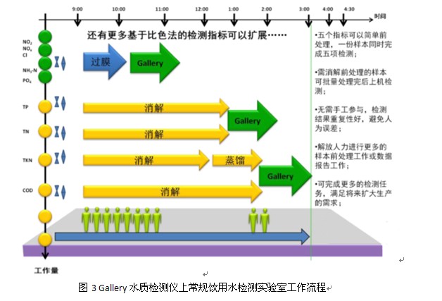 Gallery水質(zhì)檢測(cè)儀能全自動(dòng)地完成從取樣、加試劑、攪拌、清洗、反應(yīng)、顯色、讀取結(jié)果一系列步驟,有效地改善水質(zhì)檢測(cè)實(shí)驗(yàn)流程和人員分配。 自動(dòng)化控制系統(tǒng)、高精度移液系統(tǒng)和高性能的光學(xué)系統(tǒng),確保檢測(cè)精度和重復(fù)性。多種水質(zhì)檢測(cè)項(xiàng)目無(wú)需前處理或只需簡(jiǎn)單前過(guò)濾等處理的項(xiàng)目可完全轉(zhuǎn)移到Gallery水質(zhì)檢測(cè)儀上。實(shí)驗(yàn)人員將更多精力轉(zhuǎn)移到需要消解、蒸餾等前處理的項(xiàng)目上,并由全自動(dòng)分析儀完成最后的檢測(cè)工作。 經(jīng)實(shí)驗(yàn)驗(yàn)證后,運(yùn)用Gallery水質(zhì)檢測(cè)儀,上述常規(guī)的水質(zhì)檢測(cè)實(shí)驗(yàn)室工作流程即可得到高效的簡(jiǎn)化,結(jié)果如圖3所示。