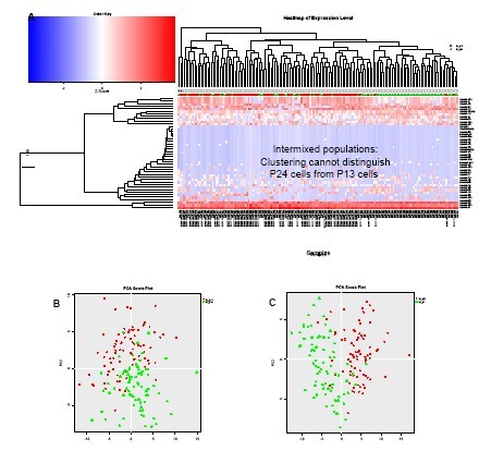 A) Unsupervised clustering of the data from two different cultures of BJ embryonic fibroblasts obtained at difference passage numbers (P13 and P24) is not able to distinguish the populations from one another, even though it can reveal different miRNA expression patterns between individual cells. B) PCA analysis of the miRNA expression data from P13 and P24 cells confirms that the two cell populations are undistinguishable based on miRNA expression. C) When the passage numbers are more distant (P7 vs. P24), PCA analysis of the miRNA data (heatmap not shown) distinguishes passage number P7 from P24.