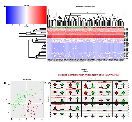 (C) Violin Plot顯示了不同亞群中miRNA 的差異性表達(dá),以及主成分1和2的主要貢獻(xiàn)者(左上至右下的順序)。iPS和NPC之間5種miRNA的表達(dá)變化,和使用microassay從胚胎干細(xì)胞(ES)及其NPC后裔得到的趨勢(shì)相同(未發(fā)表數(shù)據(jù),Yao Shuyuan友情提供)。