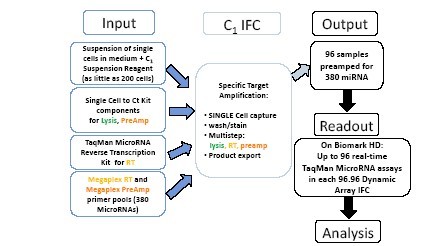 The C1 Single-Cell Auto Prep System performs Specific Target Amplification (STA) of miRNA transcripts from single cells using the reagents and a protocol developed for this purpose by Life Technologies (protocol “Single-cell MicroRNA expression analysis”). The whole process, from loading the cell suspension on the C1 Integrated Fluidic Circuit (IFC) to full data analysis of the data can be accomplished in less than 24 hours.