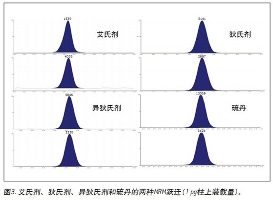 圖3顯示了硫丹、艾氏劑、狄氏劑和異狄氏劑低濃度標準品的兩種MRM離子躍遷。這表明該技術(shù)適用于分析其它難以通過傳統(tǒng)技術(shù)進行分析的化合物。