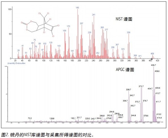 過去,諸如硫丹、環(huán)戊二烯類殺蟲劑(如艾氏劑、狄氏劑、異狄氏劑)之類的有機氯殺蟲劑被證明在采用EI+電離時會產(chǎn)生大量的碎片,而導(dǎo)致難以分析。由于這種裂解作用,造成選擇合適的母離子產(chǎn)生MRM分析所需的離子通道也變得十分困難。圖2顯示了來自NIST 08譜庫的硫丹譜圖以及由APGC獲得的硫丹譜圖的對比。與EI+譜圖相比,APGC譜圖表現(xiàn)出碎片顯著減少。