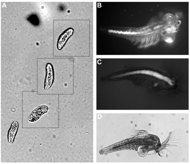 含許多微生物的新鮮積水樣品以及brine shrimp幼蟲