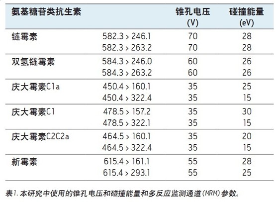 表1匯總了本研究中使用的錐孔和碰撞參數(shù)和多反應(yīng)監(jiān)測(cè)(MRM)轉(zhuǎn)換。