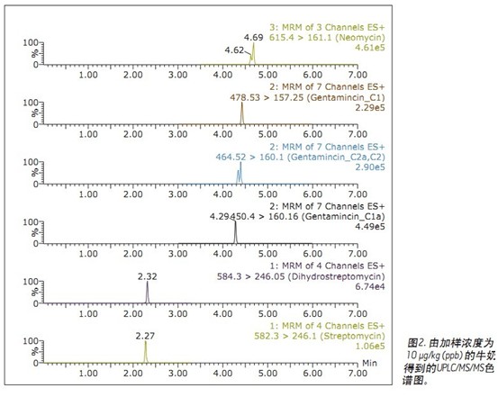 圖2是由加標(biāo)牛奶樣品得到的重現(xiàn)的UPLC/MS/MS圖譜。相同的條件也可用于牛 肉樣品的分析。