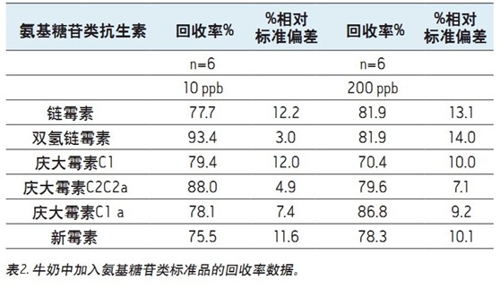 表2(乳品)和表3(肌肉組織)顯示加標(biāo)實(shí)驗(yàn)得到的結(jié)果在。新霉素(B和C)和慶大霉素(C2a和C2)