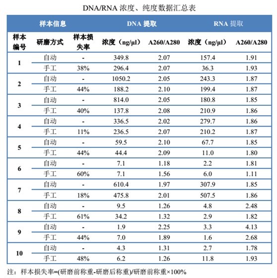 對比TL2010S中通量自動研磨儀與手工液氮法研磨后的新鮮組織樣本在 DNA提取、RNA 提取性能方面的差異,評估自動研磨儀的適用性。