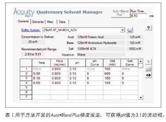 利用ACQUITY UPLC H-Class系統(tǒng)內(nèi)置的Auto•Blend Plus技術(shù)設(shè)定酸性/堿性儲備緩沖液與有機/水性溶劑的共混比例,從而獲得具有恒定pH值的流動相。使用ACQUITY QDa檢測器對鹽酸齊拉西酮和相關(guān)化合物進行確證。在這項pH篩選研究中,設(shè)定不同比例的125 mM甲酸、氫氧化銨儲液、乙腈和水,通過四元泵進行混合,分別得到pH值為3.1、4.0和5.0的流動相。表1顯示了pH值設(shè)置為3.1的Auto•Blend Plus方法。圖1顯示了pH值對分離鹽酸齊拉西酮和相關(guān)化合物的影響。