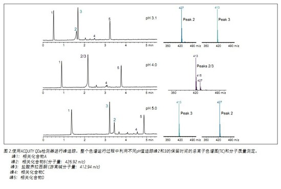 如圖1所示,pH值的增加導致所有峰的保留延長。與pH 3.1或5.0相比,pH值為4.0時觀察到的峰更少。使用ACQUITY QDa檢測器在不同pH值下對方法開發(fā)過程中的峰進行追蹤和鑒定。