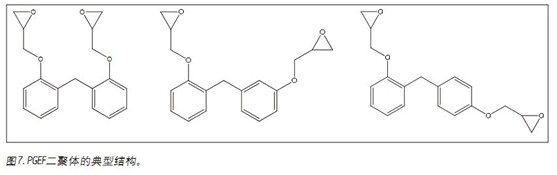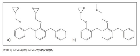 當(dāng)查看同一分離的總離子色譜圖(TIC)時(圖9),在二聚體和三聚體之間觀察到額外的峰。觀察到的離子簇的m/z比率為404和402。這些質(zhì)量數(shù)可能源于苯基縮水甘油基醚結(jié)構(gòu)的改變,可能是其丟失了一條縮水甘油基醚鏈抑或醚環(huán)發(fā)生了開環(huán)(圖10)。之后包含所述降解單元的低聚物也出現(xiàn)在三聚體和四聚體之間。
