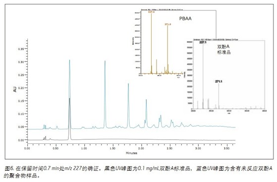 使用確證標(biāo)準(zhǔn)品通過UV和MS檢測對未反應(yīng)的雙酚A進行確證(圖6)。雙酚A標(biāo)準(zhǔn)品的保留時間與聚合物樣品中的未知峰相一致。而且,雙酚A的MS譜圖也與目標(biāo)峰的譜圖匹配。而甲酸加合物同樣出現(xiàn)在質(zhì)譜圖中,也為此提供了額外的佐證。