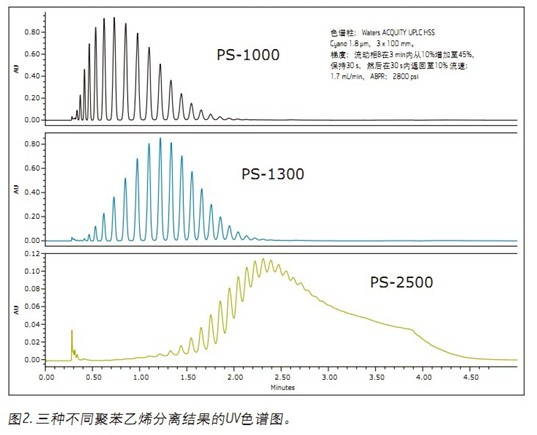 2對多種分子量的聚苯乙烯和PMMA(圖1)進行評估。圖2顯示了三種不同聚苯乙烯的分離。所有PS-1000和PS-1300低聚物的分離都在2.5分鐘內(nèi)完成。但是,PS-2500僅實現(xiàn)了部分分離。隨著分子量增大,聚合物的復(fù)雜程度也相應(yīng)增加,以致無法達到基線分離。
